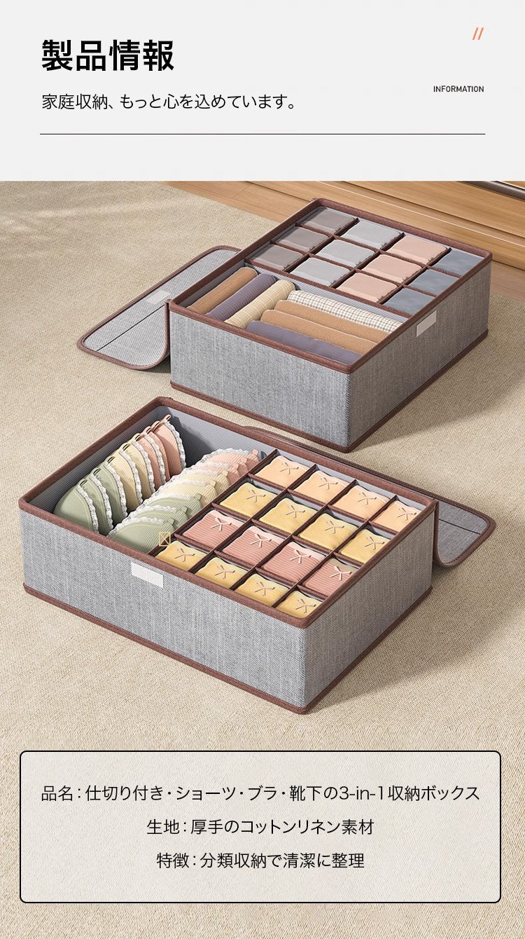 仕切り付き・ショーツ・ブラ・靴下の3-in-1収納ボックス